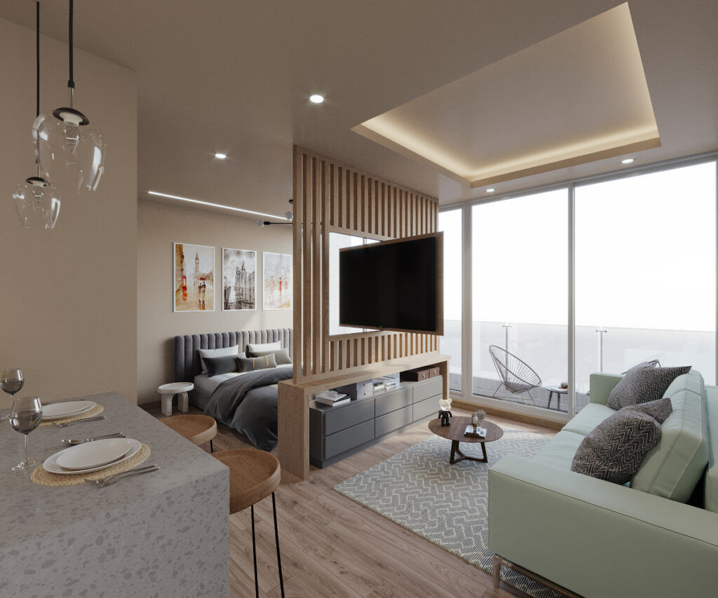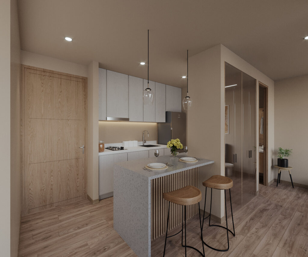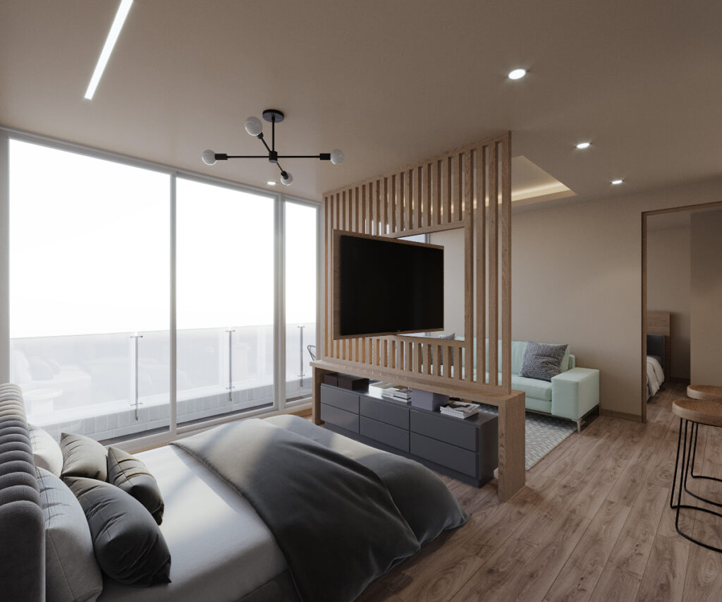 El hotel contará con 70 unidades tipo lock-off de 62 m2, distribuidas entre un apartamento de una habitación y una suite hotelera con accesos independientes, permitiendo flexibilidad entre uso residencial y alojamiento.