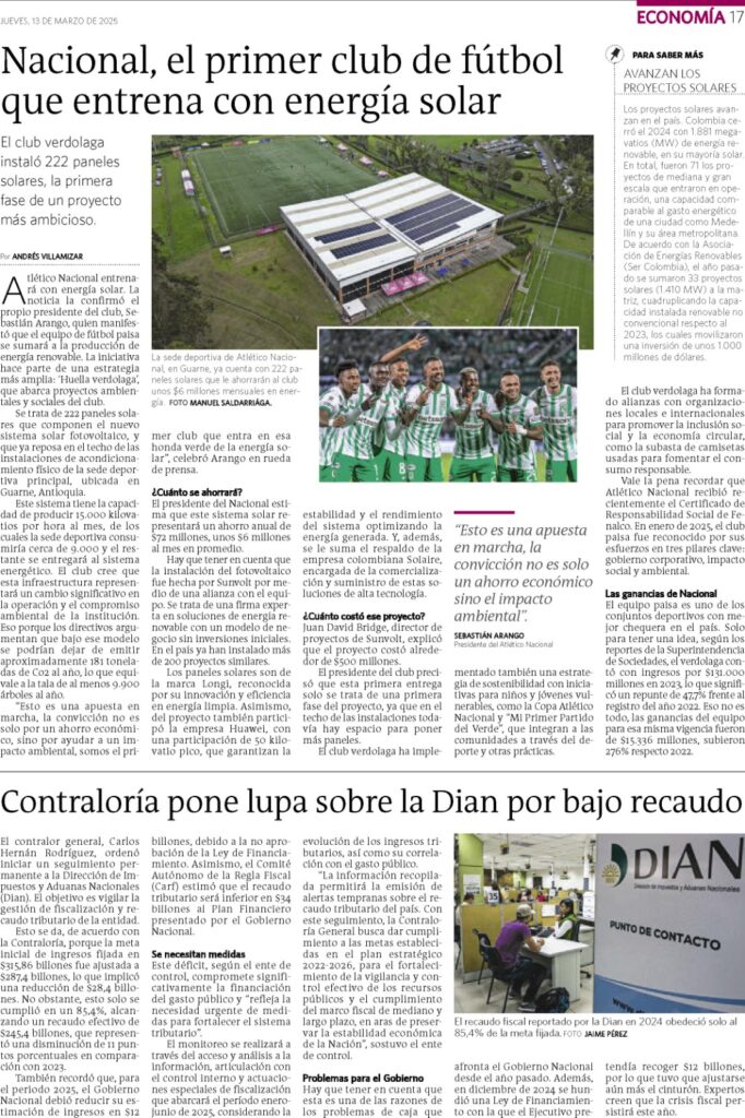 El club le apuesta ahora a la instalación de un Sistema Solar Fotovoltaico en su sede Deportiva de Guarne, Antioquia, convirtiéndose así en el primer equipo de fútbol en Colombia en apostar por la energía solar para su sede. Este hito es posible gracias Sunvolt, empresa experta en soluciones de energía renovable, con un modelo de negocio sin inversiones iniciales.