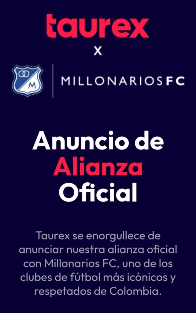 “Estamos increíblemente orgullosos de asociarnos con uno de los clubes de fútbol más icónicos y respetados de Colombia”, afirmó Nick Cooke, CEO de Taurex. “Esta colaboración representa un hito significativo en la expansión de Taurex y en su creciente reconocimiento en América Latina, totalmente alineado con nuestras ambiciones globales. Juntos, esperamos crear conexiones significativas con la comunidad de aficionados de Millonarios, al tiempo que conectamos a traders principiantes y experimentados de toda la región con nuestro ecosistema innovador de trading e inversión”.